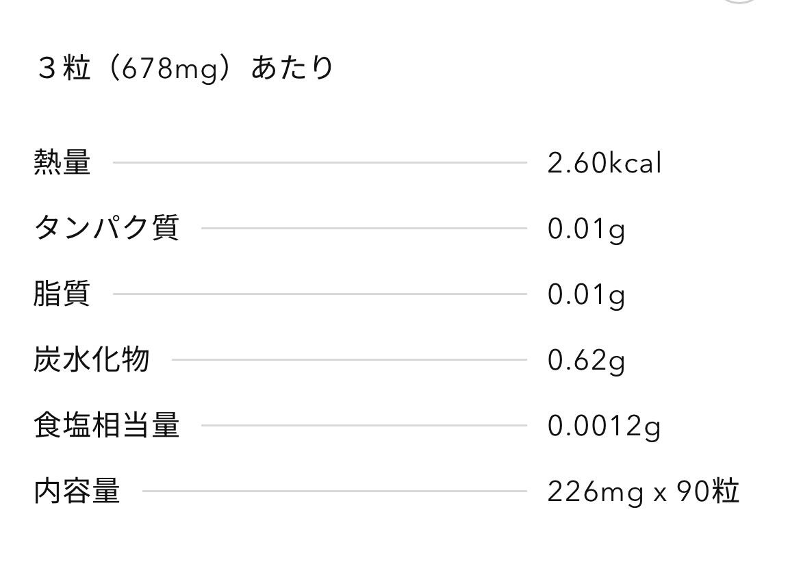 イヌリン(タイ製造)、乳酸菌粉末(デキストリン、乳酸菌、乳糖)、酪酸菌粉末(でん粉、酪酸菌、乳糖)、ラクチュロース、ぶどう糖、マンガン含有酵母、亜鉛含有酵母、銅含有酵母、モリデブデン含有酵母、ヨウ素含有酵母、セレン含有酵母、クロム含有酵母/セルロース、HPMC、ステアリン酸 Ca、微粒酸化ケイ素、ビタミンC、カラメル色素、ナイアシン、パントテン酸 Ca、ビタミン B1、ビタミン B6、ビタミン B2、ビタミン B12(一部に乳成分・大豆を含む)