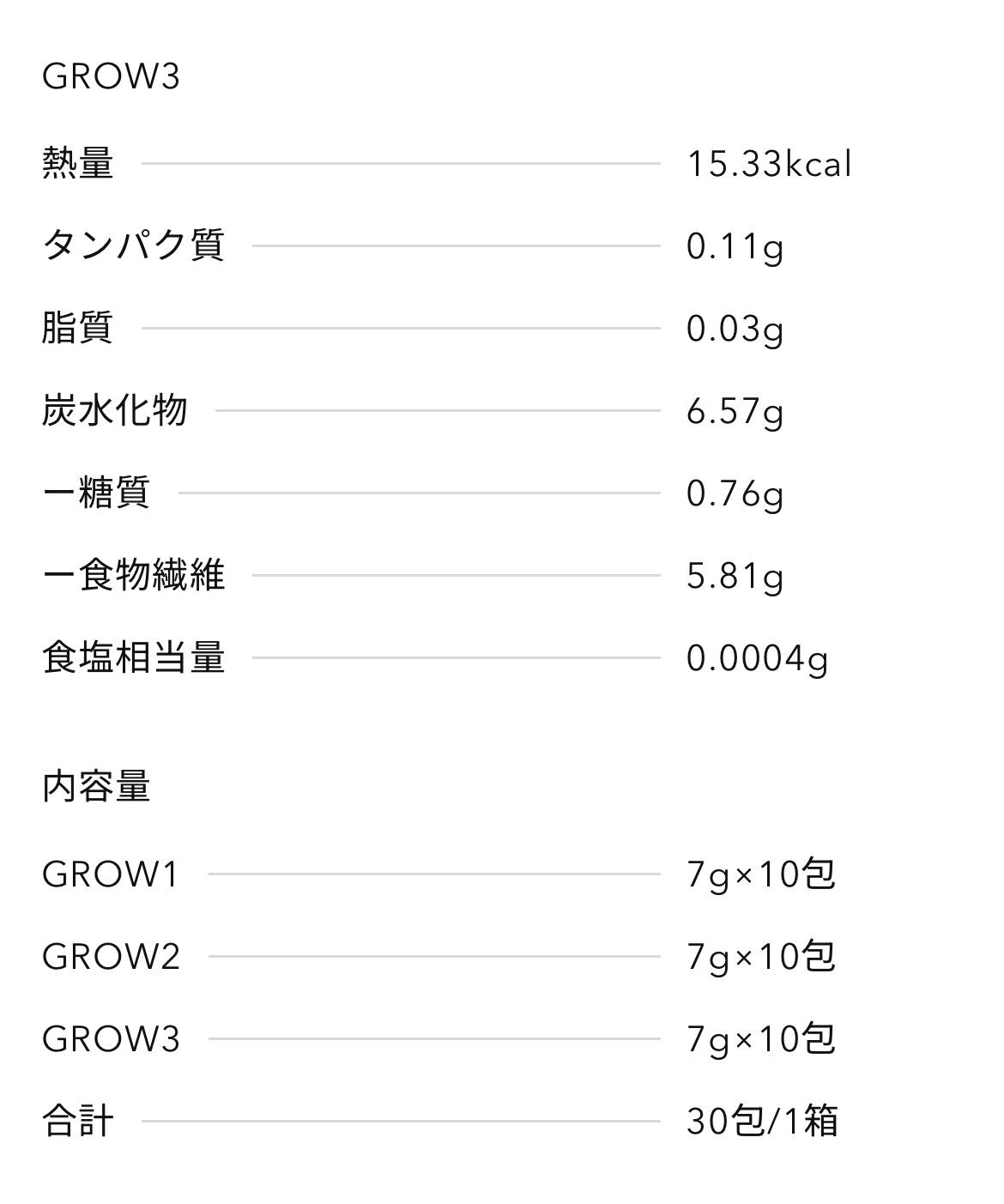 【GROW1】イヌリン (オランダ製造)、グアーガム酵素分解物、緑茶エキス 末(緑茶、デキストリン)、抹茶、フラクトオリゴ糖、イソマルトオリゴ糖粉あめ、ガラ クトオリゴ糖粉末、ラクチュロー ス、ラフィノース、粉末はちみつ、野菜ミックス粉 末(ケール、ブロッ コリー、ヨモギ、アスパラガス、オクラ、コマツナ、カボチャ、ダ イコン葉、パセリ、ホウレンソウ)、わかめ、がごめ昆布、昆布、根昆布、ショ糖、(一 部に乳成分を含む)