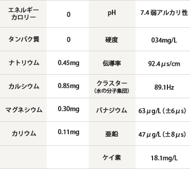 ミューバナディスには、毎日の食事では摂取しづらいミネラルがたくさん含まれています。弱アルカリ性で、硬度34の軟水なので、そのまま飲むのはもちろん、ご飯を炊くときに使ったり、料理やコーヒー、お茶をいれるのにも最適です。赤ちゃんのミルク作りや薬を飲むときにも安心してご利用いただけます。